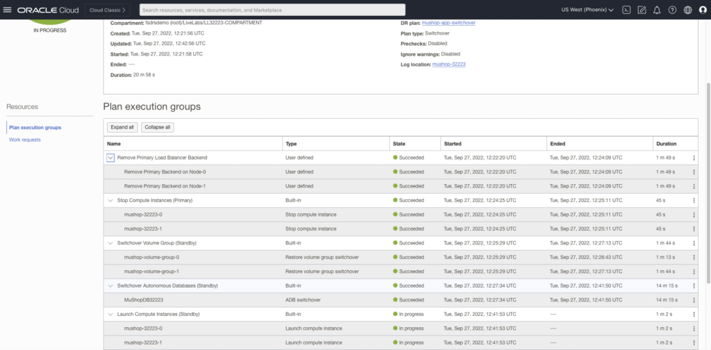 - Once each plan group is executed successfully, it will move on to the next group for execution. Here you can see Remove Primary Load Balancer Backends completed successfully (State-Succeeded) and the next group Stop Compute Instances (Primary) started running (State: In progress).