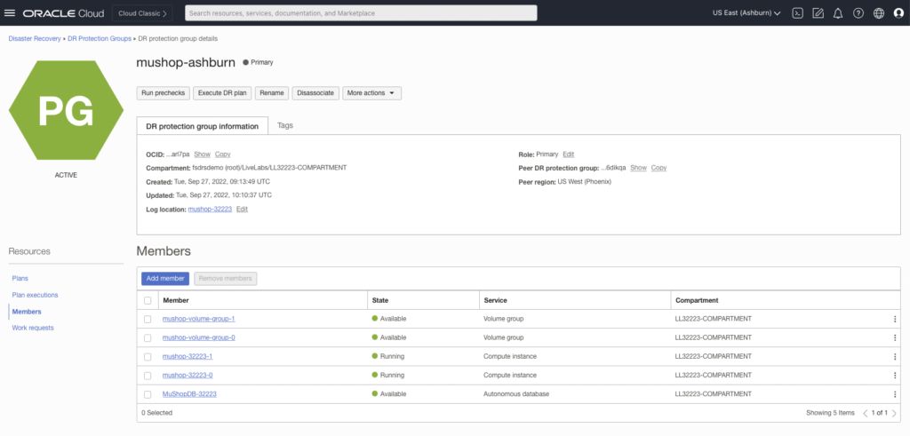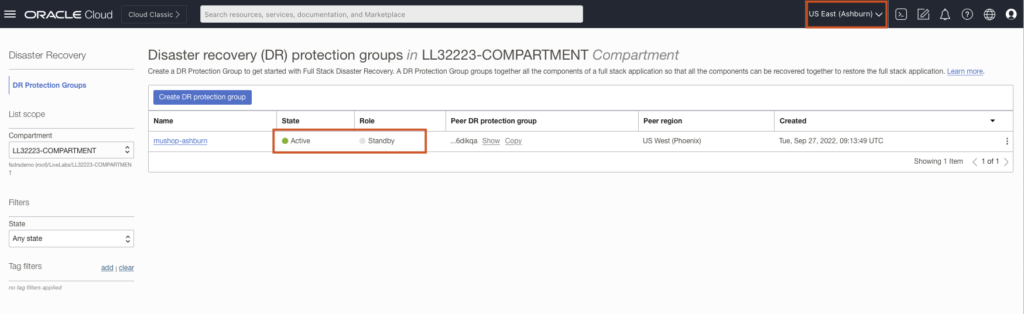 - Notice the Role of the mushop-ashburn DRPG; it has automatically changed to Standby. Now we have our new standby region as Ashburn region.