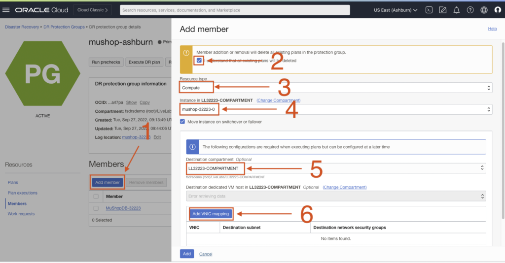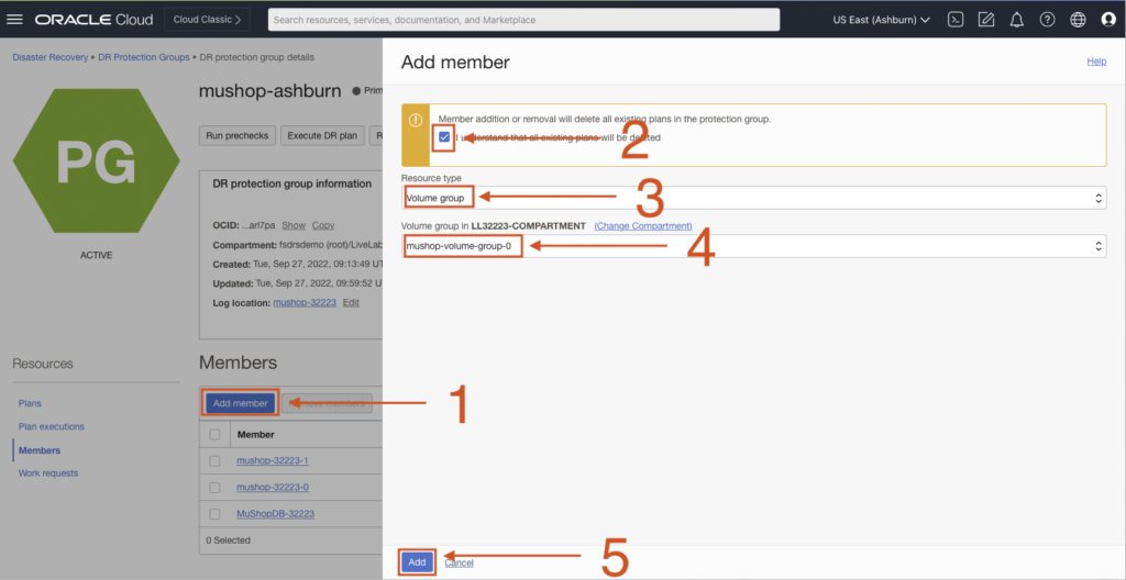 At the primary DRPG (Ashburn), click at the members (1) option at the Resources tab, click “add member” (2), accept the warning (3), select the Autonomous Database as the resource type (4), ensure the correct compartment is in use (5) and then click add.
