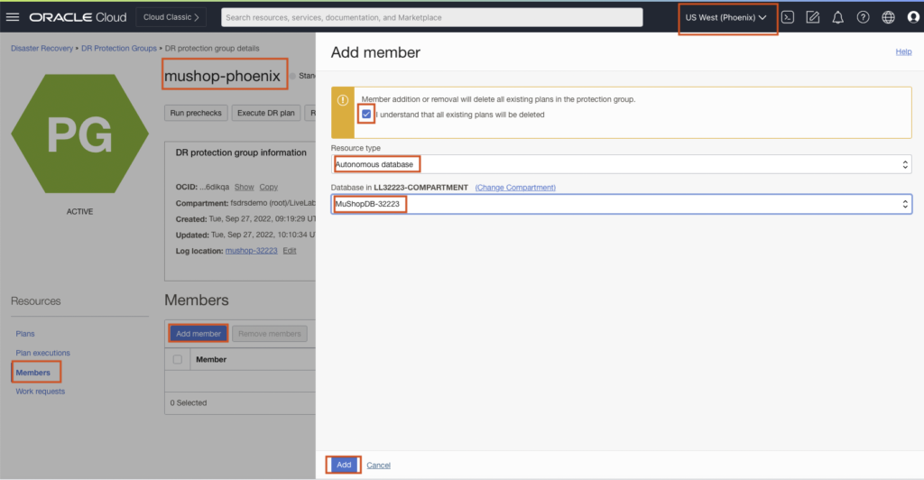 With the Primary DRPG complete, we will now move to the tab open at the Phoenix Region and start adding our member to the Standby (Phoenix) DRPG.