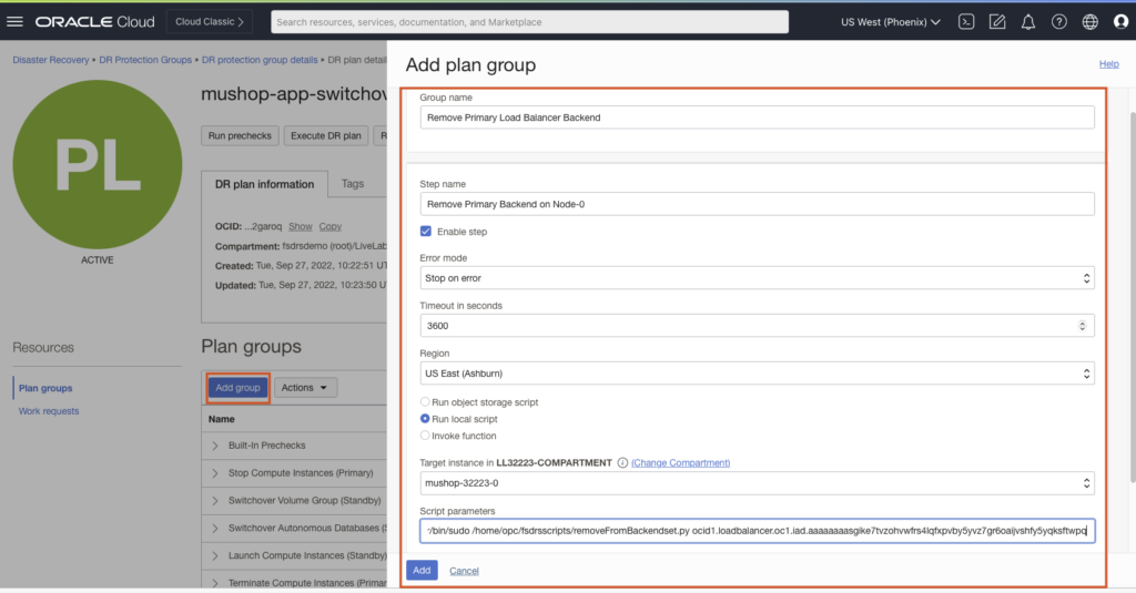 - In script parameters, add the below script using the primary (Ashburn) OCID
