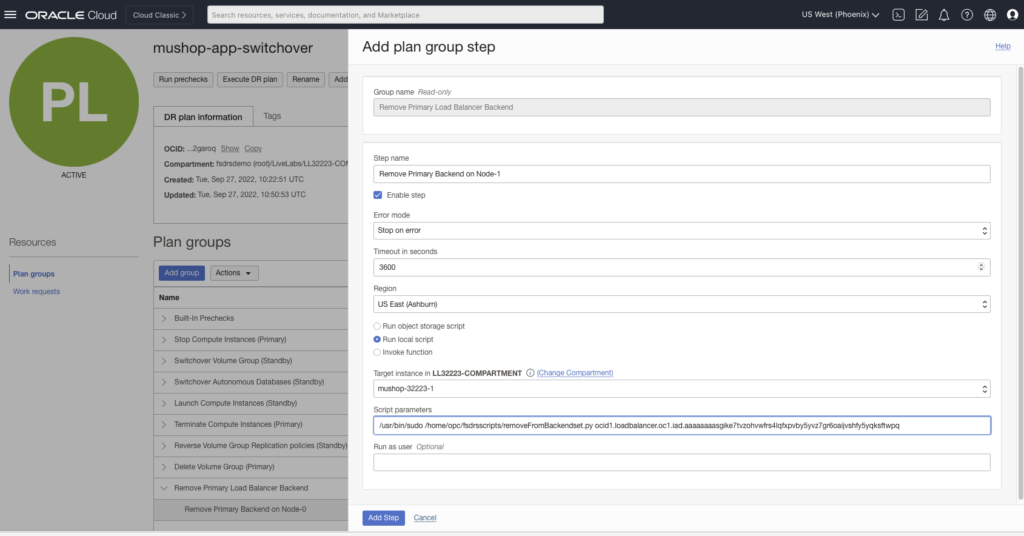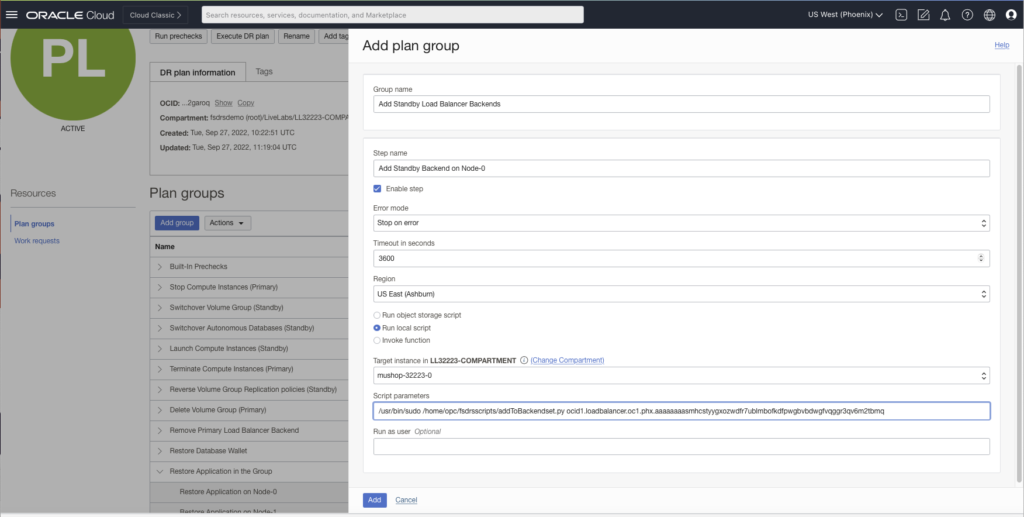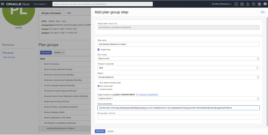 You need to replace the OCID of the standby (Phoenix) load balancer as per step 2.6; make sure you replace the OCID of your load balancer without fail in the above command,remove angle brackets,note there is space after addToBackendset.py