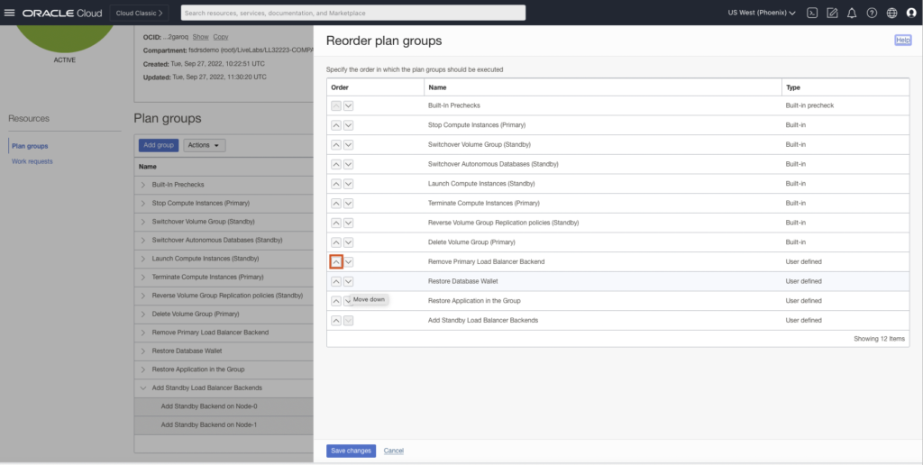 Go to the Remove Primary Load Balancer Backends plan group, use the move up ^ symbol, and keep moving up the Remove Primary Load Balancer Backends plan group and place it after the Built-In Prechecks plan group. This is very important to execute the plan groups in the proper order. Verify and hit Save changes. Don’t move the other groups.