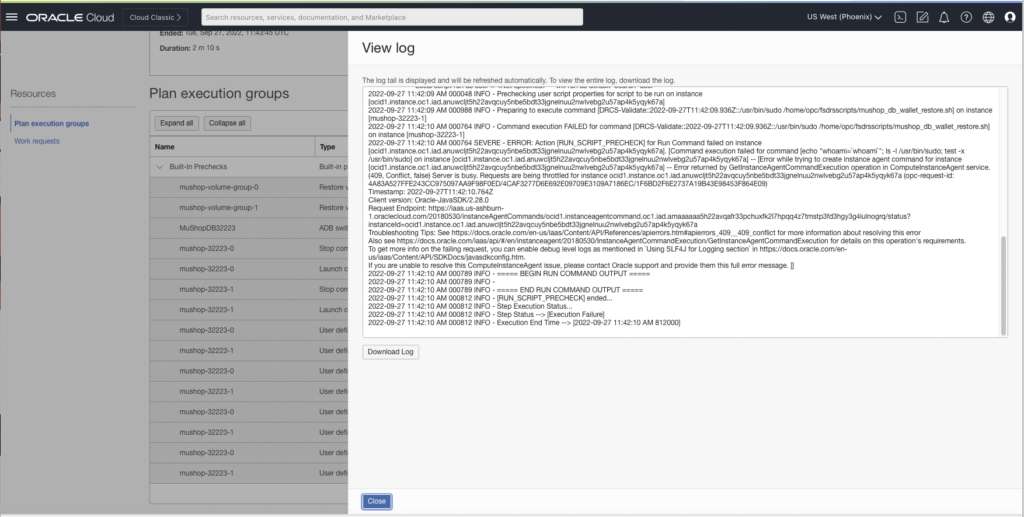 - Monitor the various plan group and steps which are running. Navigate to the three dots section for the respective plan group step and click. You get the option to view the log and download the log. These logs are stored in the object storage bucket provided during the DRPG creation. You can monitor the Progress and download the log if necessary for troubleshooting.